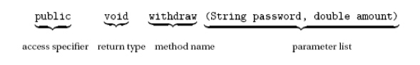 access specifier: tells which other methods can call this method. (public, private, default, static)