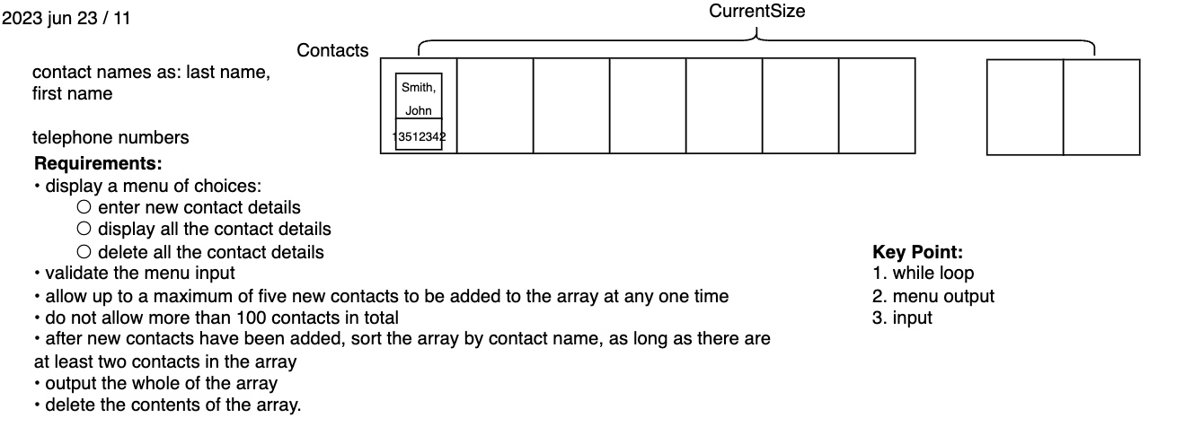 The variable CurrentSize shows how many contacts are in the array. Write a program that meets the following requirements: