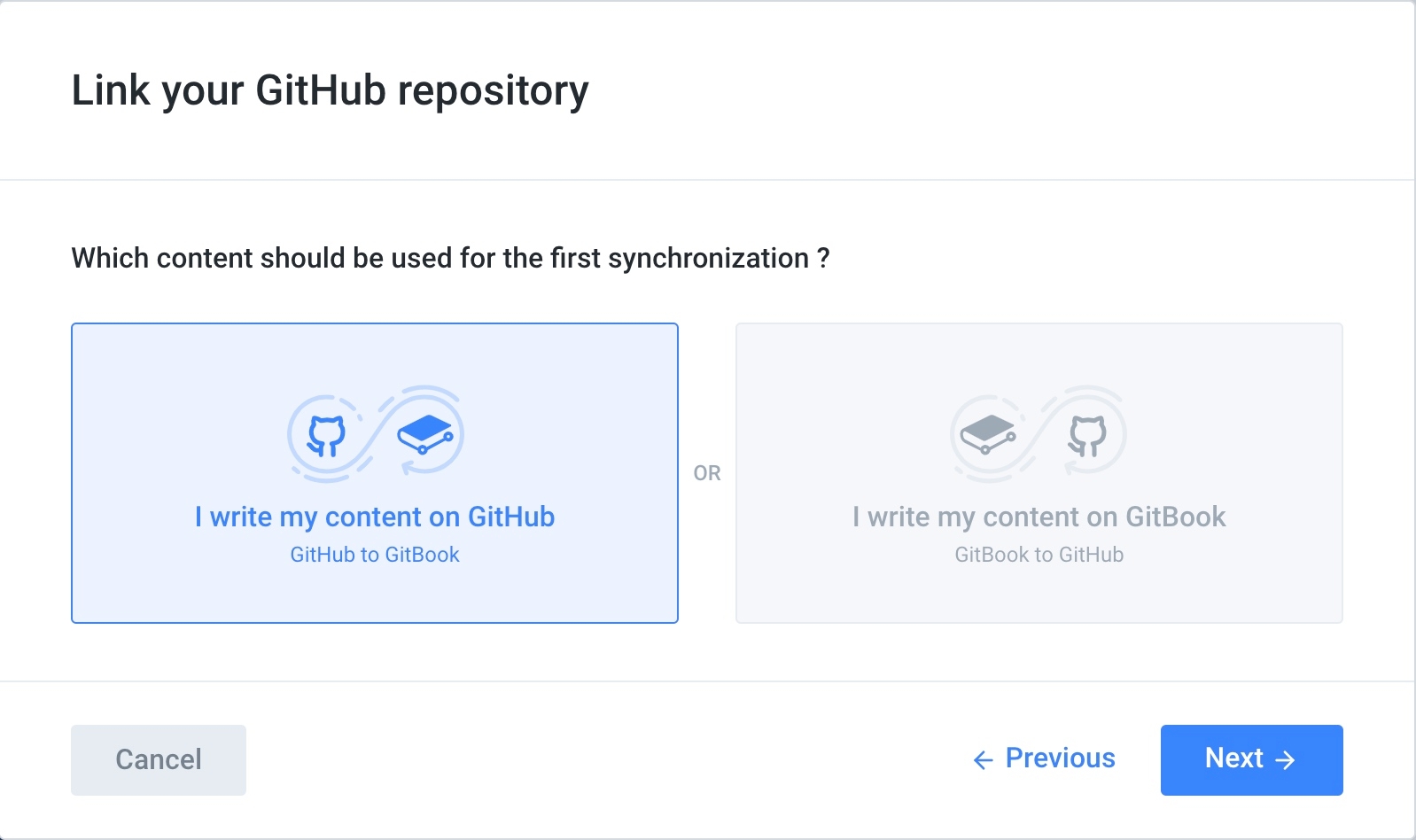 下面这步比较重要,如果我们是一个新项目,需要同步数据到github,那么我们需要选择 I write my content on GitBook. 如果我们在github上面已有gitbook的相应同步内容,我们需要导入到app里面的项目中去的话,我们可以选择I write my content on Github。