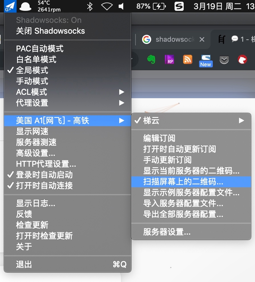 然后选择扫描屏幕上的二维码也可以将服务添加到本地。 (这也是某些时候如果出现订阅无法添加的时候,可以先配置一个可以使用的代理,然后通过代理来添加服务器的方法,这样能够保证翻墙)