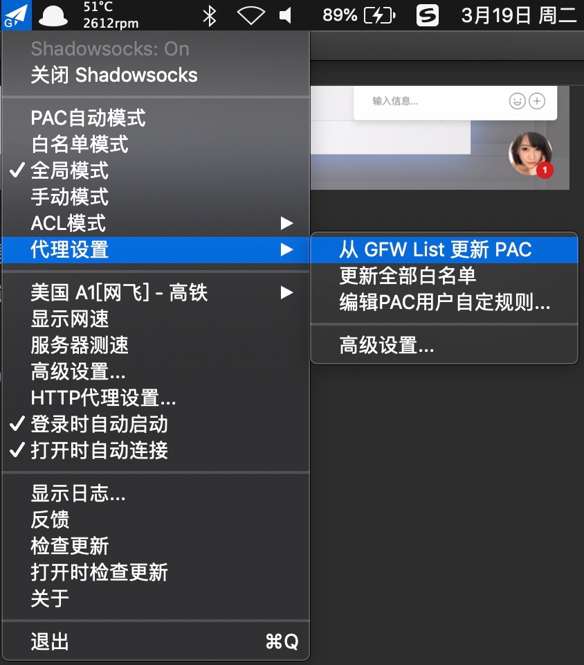 可以直接使用更新GFW List来更新PAC,这样可以保证大多数国外被墙掉的网站可以访问。如果有一些网站访问较慢,希望使用PAC模式的话,可以使用编辑PAC用户自定义规则...来添加设置自己的翻墙内容