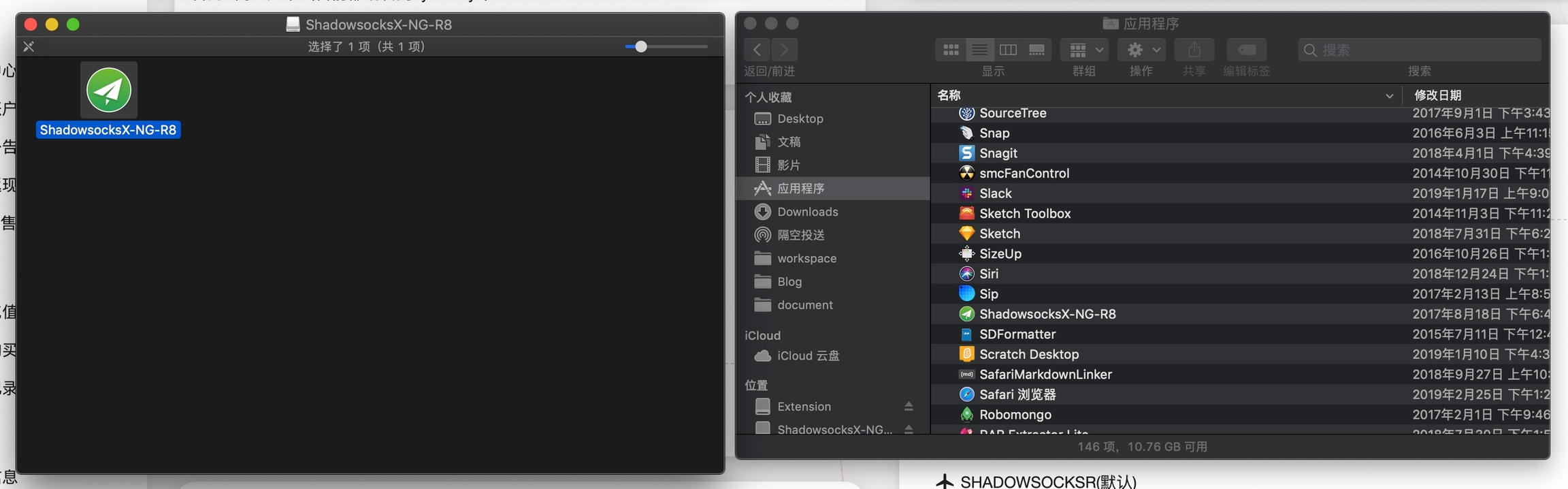 拖动ShadowsocksX-NG-R8 到 右边的Application(应用程序)文件夹