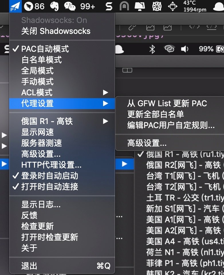 平时使用的时候建议使用PAC模式,这样可以绕过大多数GFW列表网站