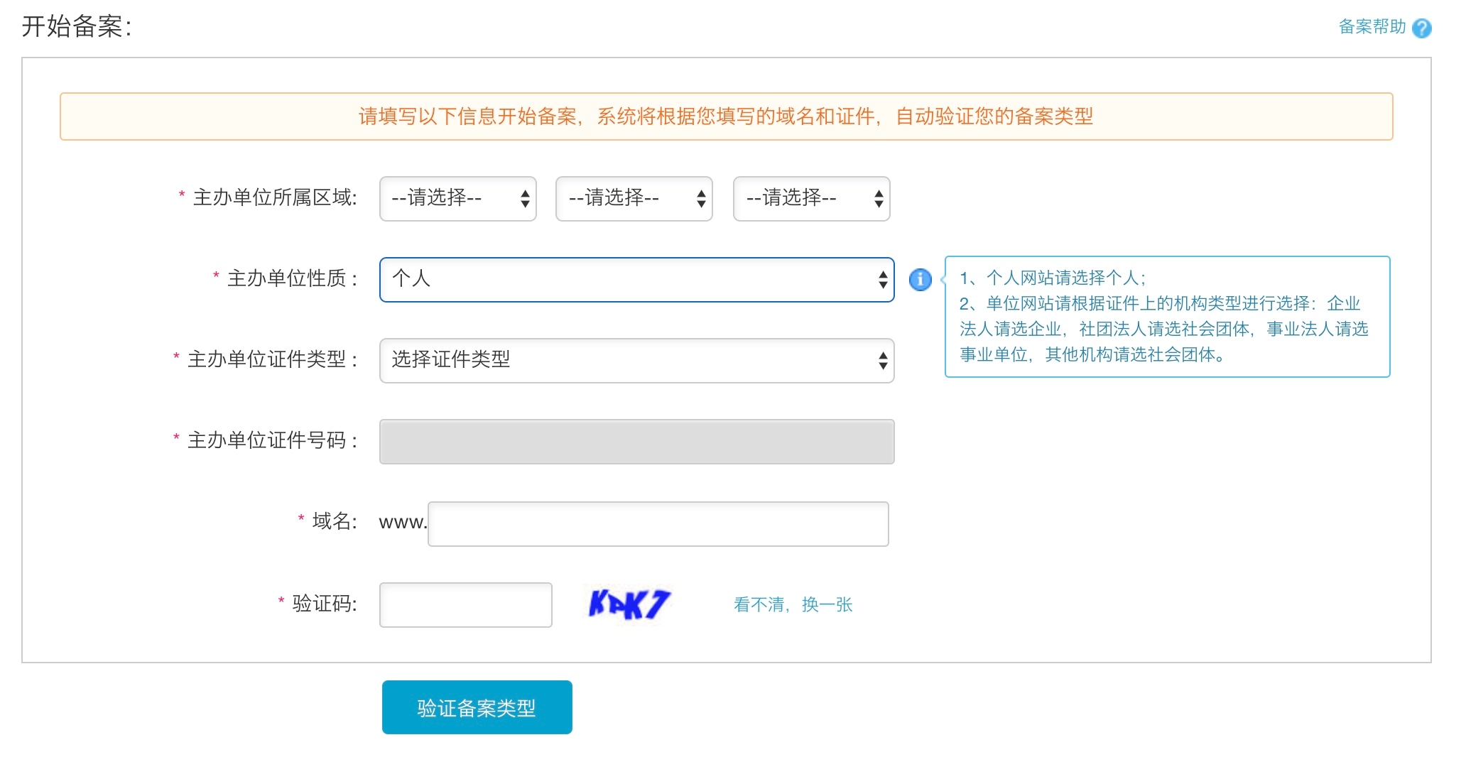 我们可以使用个人性质进行备案。需要使用身份证进行备案。