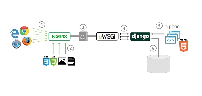在服务器端部署和安装涉及到Nginx、uWSGI、python、django、mysql、Git等环境。