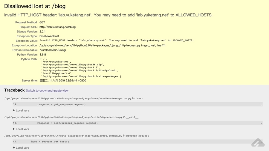 直接访问会出现如下问题,是由于没有加入到allowed_hosts中的原因。