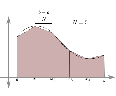 Background: in calculus, we use the integral of a function f from x=a to x=b to compute the area under the curve between those points (or the negative area if the function is below the x-axis). One way to approximate this area (that is, to find it without doing any actual calculus!) is by replacing the smooth function with a collection of N trapezoids, as shown in this image (from here, with N=5):