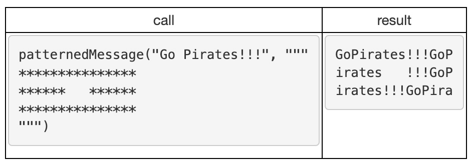 Here, the message is "Go Pirates!!!" and the pattern is a block of asterisks with a few missing in the middle. Notice how the whitespace in the pattern is preserved, but the whitespace in the message is removed. Also, note that any leading or trailing newlines in the pattern are removed.