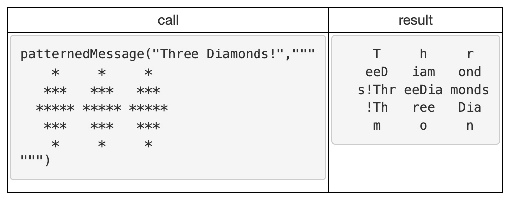 Write the function patternedMessage(message, pattern) that takes two strings, a message and a pattern, and returns a string produced by replacing the non-whitespace characters in the pattern with the non-whitespace characters in the message. As a first example: