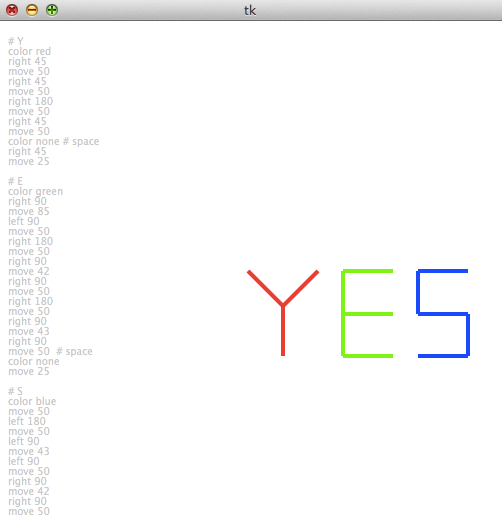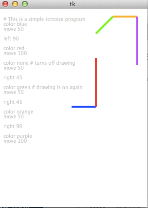 In addition to the Tkinter which we all know and love, Python usually comes with another graphics package called "Turtle Graphics", which you can read about here. We will definitely not be using turtle graphics in this problem (and you may not do so in your solution!), but we will instead implement a small turtle-like (or maybe turtle-inspired) graphics language of our own. We'll call it Tortoise Graphics.
