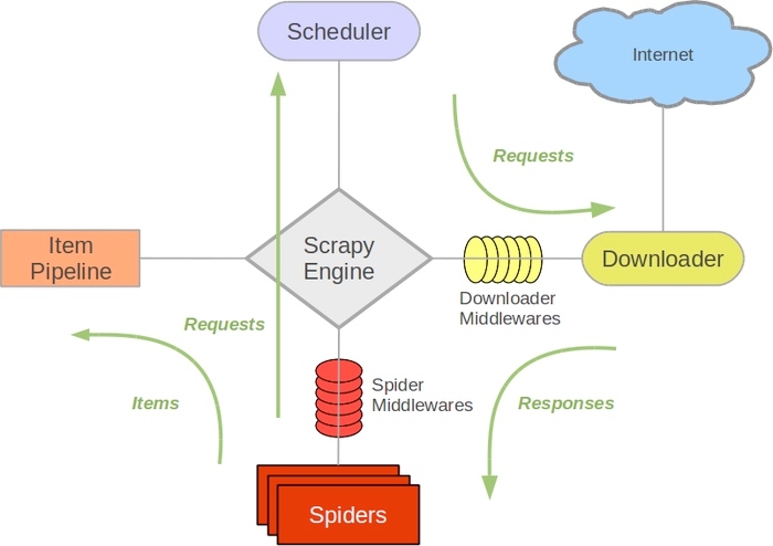 接下来的图表展现了Scrapy的架构,包括组件及在系统中发生的数据流的概览(绿色箭头所示)。 下面对每个组件都做了简单介绍,并给出了详细内容的链接。数据流如下所描述。