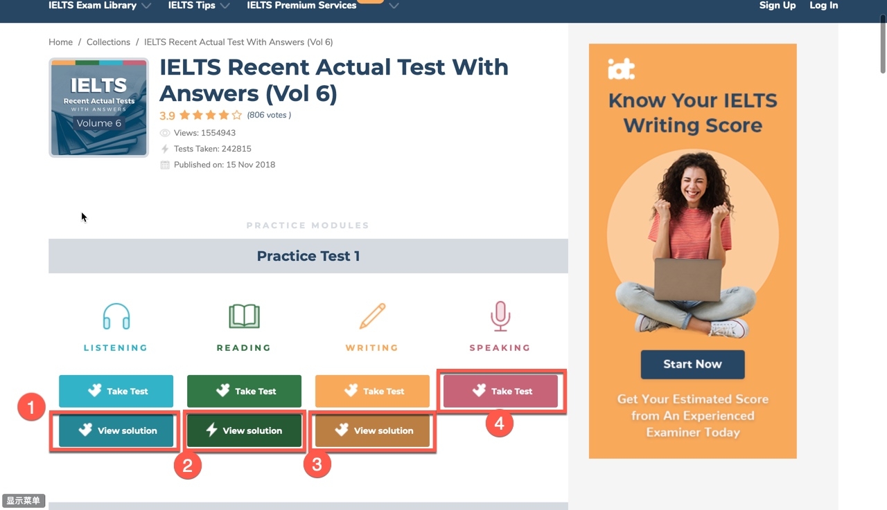 每一个TestCollection下会包含多个Practice Test。 每个Practice Test 又包含Listening、Reading、Writing、Speaking四个部分。其中Listening、Reading、Writing三个部分我们需要View Solution部分,Speaking部分我们需要Take Task部分。