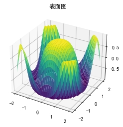 曲面图显示指定的因变量(Y)和两个独立变量(X和Z)之间的函数关系。该图是等高线图的伴随图。曲面图类似于线框图,但线框的每个面都是填充多边形。这可以帮助感知可视化曲面拓扑。plot_surface()函数x,y和z作为参数。