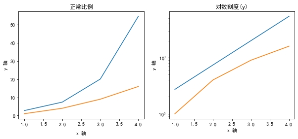 有时候一个或几个点比大量数据大得多。在这种情况下,轴的比例需要设置为对数(log)而不是正常比例。这是对数标度。在Matplotlib中,可以通过将axes对象的xscale或vscale属性设置为log。
