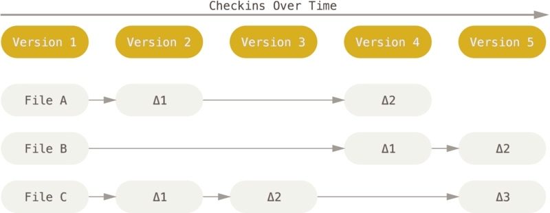 Git 和其它版本控制系统(包括 Subversion 和近似工具)的主要差别在于 Git 对待数据的方法。 从概念上来说,其它大部分系统以文件变更列表的方式存储信息,这类系统(CVS、Subversion、Perforce、Bazaar 等等) 将它们存储的信息看作是一组基本文件和每个文件随时间逐步累积的差异 (它们通常称作 基于差异(delta-based) 的版本控制)。
