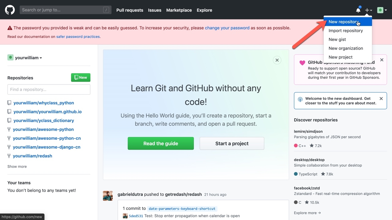进入到自己的主页之后需要创建一个代码仓库
