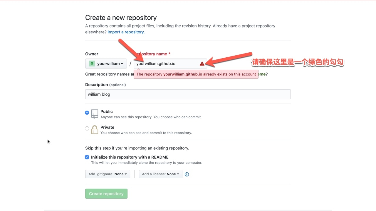 创建代码仓库的时候,特别注意,使用特定的名字 username.github.io