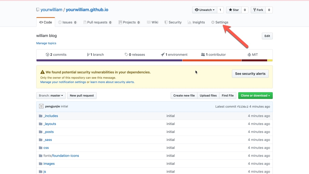 $ git push origin master提交之后我们刷新github的网页可以看到这个项目中的数据已经添加了。我们再使用其中的settings,来确保网站的正常发布
