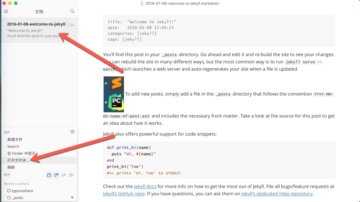 打开typora, 选择右下角的打开文件夹,找到前面的_posts文件夹,导入即可