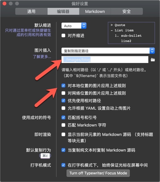 在图片插入中选择 复制到制定路径 , 然后在下面使用相对路径(千万不要使用绝对路径),相对路径输入../images/blog