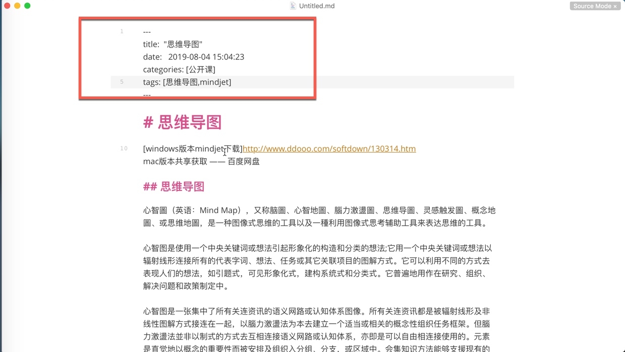 头信息的内容被夹在两行 --- 之间,你需要将它放在整个文章的最上方。每个模版对于 YAML 的定义不同。一般在你的模版中的 _post 文件夹中一定有几篇预置的文章。用文本编辑器打开它,你就能看到你所需要的头信息了,比如说我的模版: